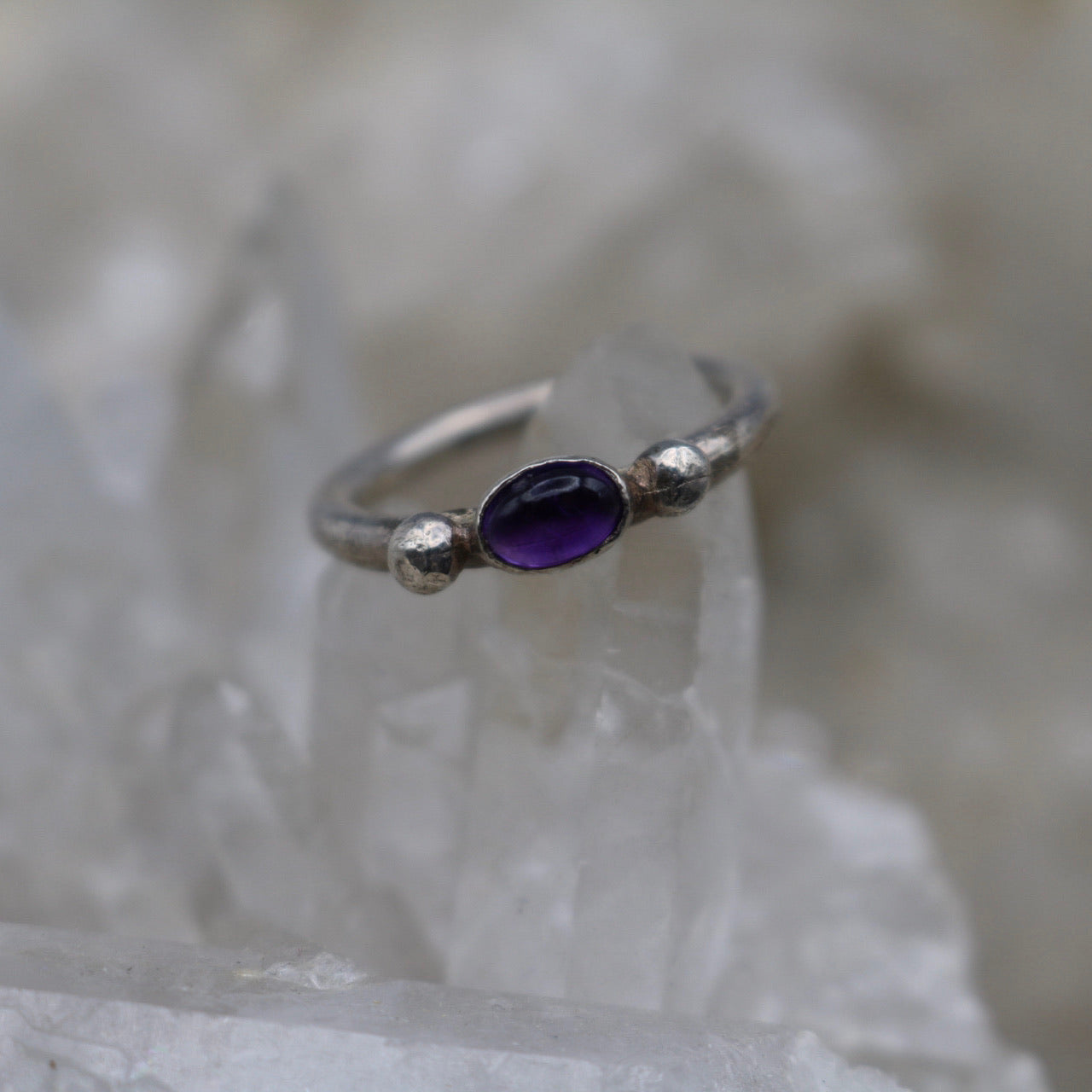An amethyst cabochon ring in sterling silver is a beautiful piece of jewelry. The ring features a smooth, polished amethyst gemstone with a rounded top, known as a cabochon, set in a high-quality sterling silver band. The deep purple color the amethyst possesses is calming. This particular ring is designed to fit a finger size 6, providing a comfortable and stylish fit for the wearer. The combination of the vibrant amethyst and sleek sterling silver creates an elegant and timeless piece of jewelry.