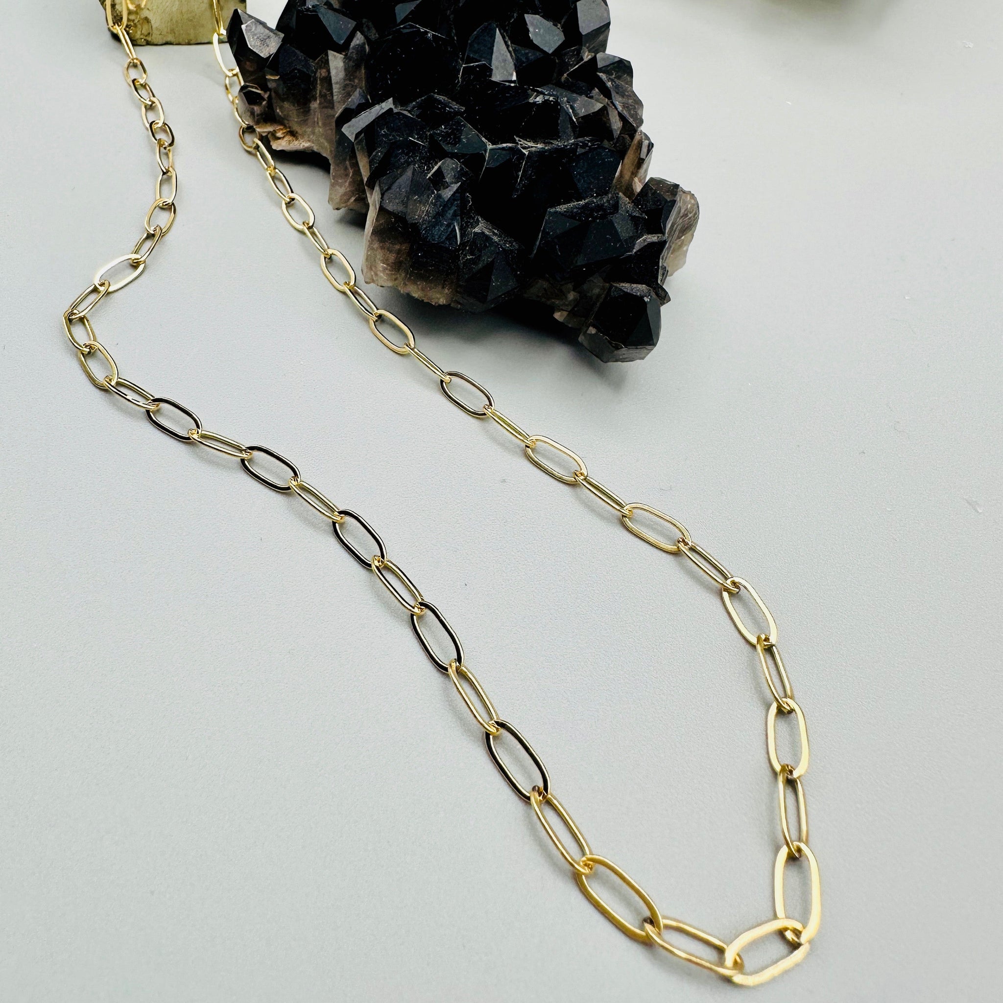 Stunning 14kt Gold-Filled Chain with a modern twist, designed to make a statement. This 18 inch chain features larger links, creating a bold and contemporary look that's perfect for those who appreciate a touch of sophistication with a modern edge.