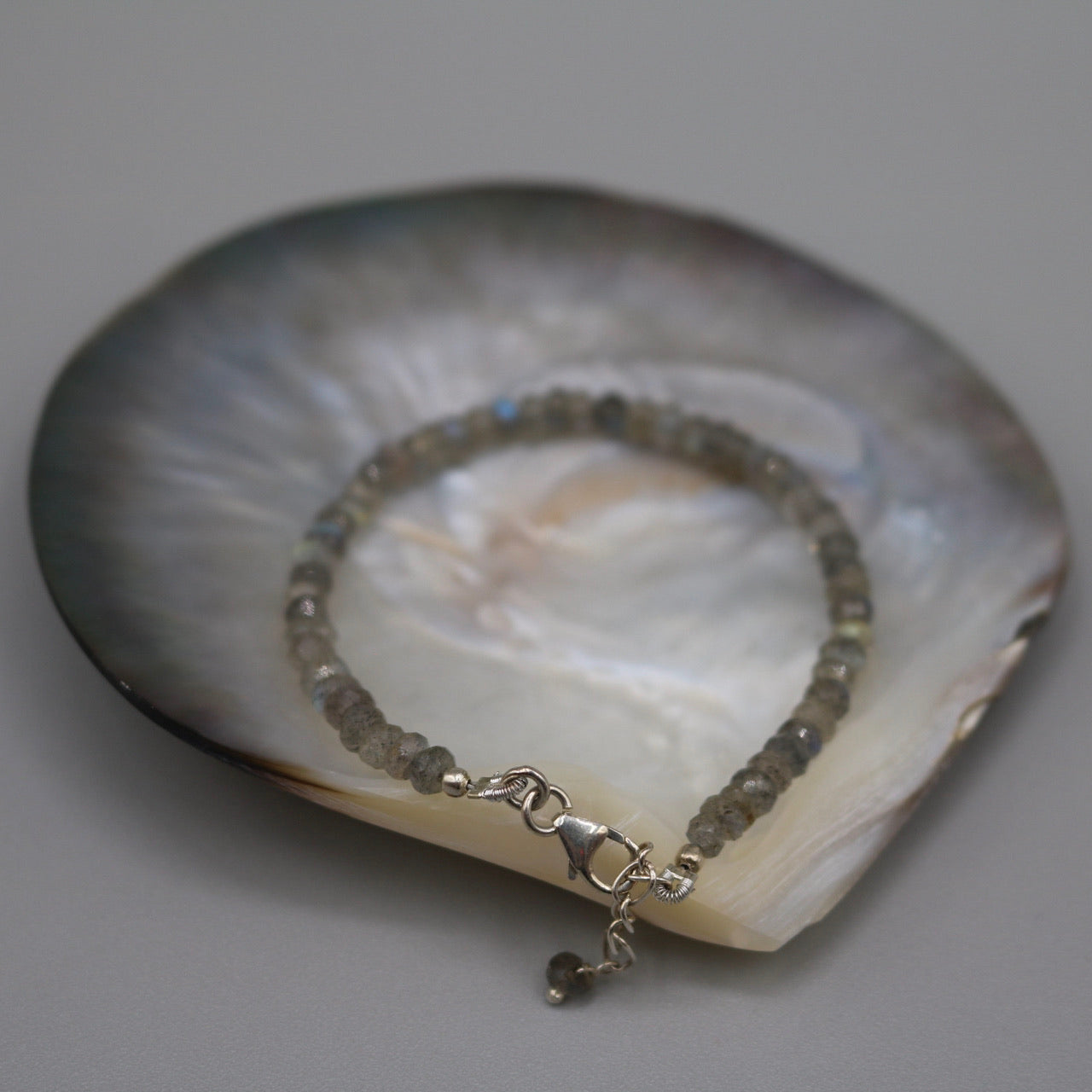 This bracelet is made with labradorite faceted beads. The bracelet is adorned with a sterling clasp and adjustable chain 7"-adding a touch of elegance to its design.